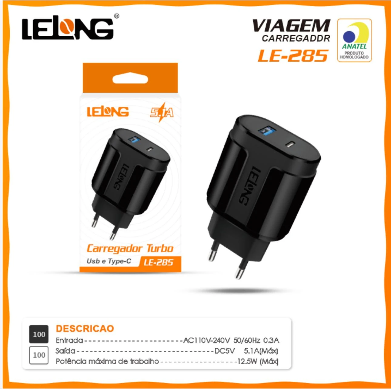 Carregador parede 5.1a TYPE-C E USB