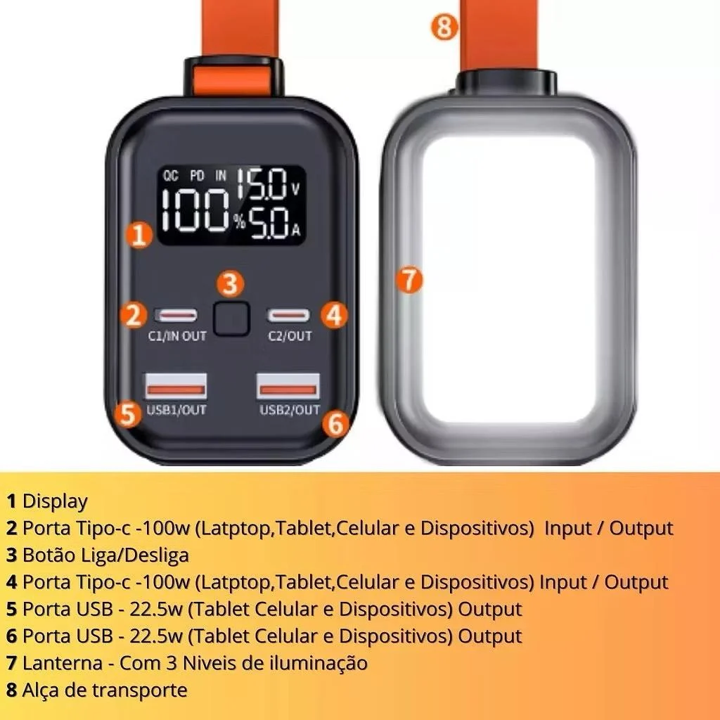 Power Bank 50000mAh com 6 Saídas 2 Cabos Display Digital e Super Carregamento Rápido 22.5W