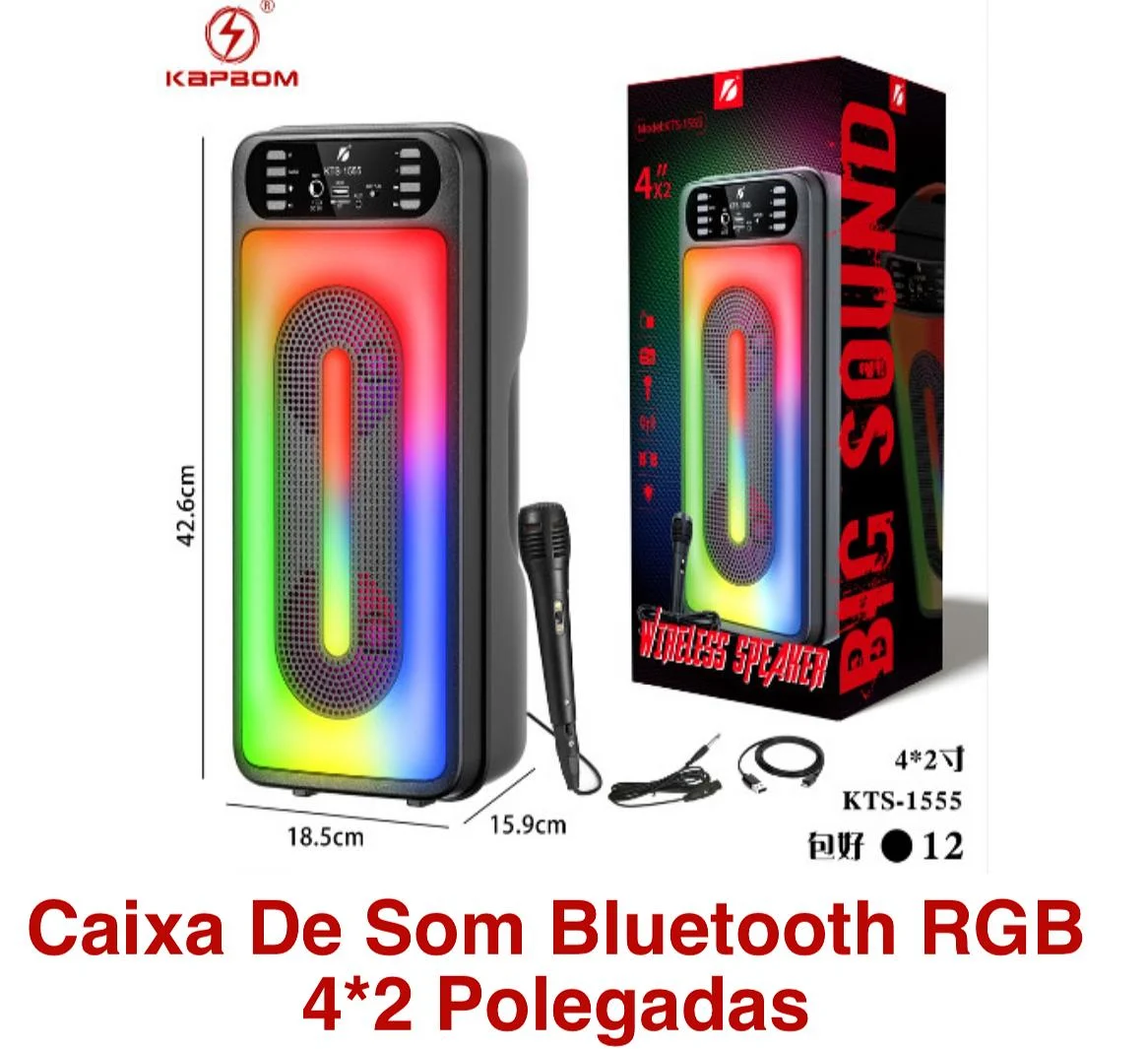 A caixa de som Bluetooth KTS-1299 sendo portátil, com dois alto-falantes de 6.5 polegadas, luzes LED RGB