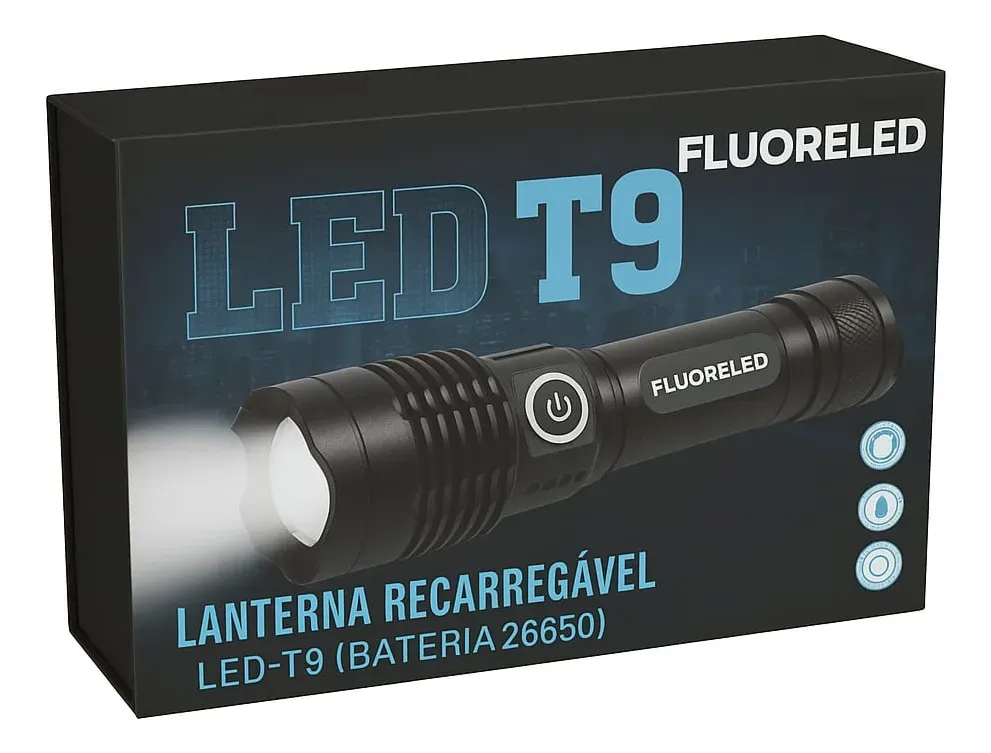 Lanterna LED T9 Recarregável, em liga de alumínio durável, ideal para camping, emergências e uso profissional. Funciona com bateria 26650 recarregável, oferecendo 3 modos de iluminação para diferentes situações. Brilho estável, construção resistente e design compacto tornam fácil levar no bolso ou na mala. Perfeita para casa, carro ou atividades ao ar livre.