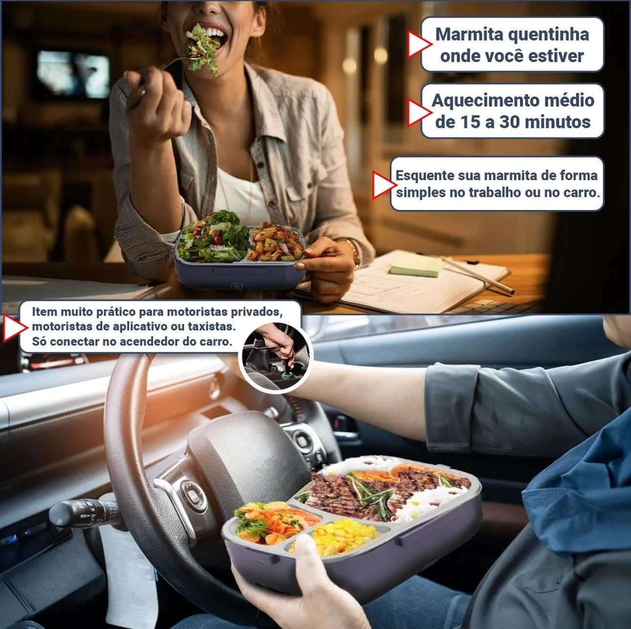 Caixa de Almoço Elétrica Portátil com divisões em aço inox, ideal para manter a comida quente por várias horas. Possui câmara interna removível, tampa hermética e fechamento seguro para evitar vazamentos durante o transporte.