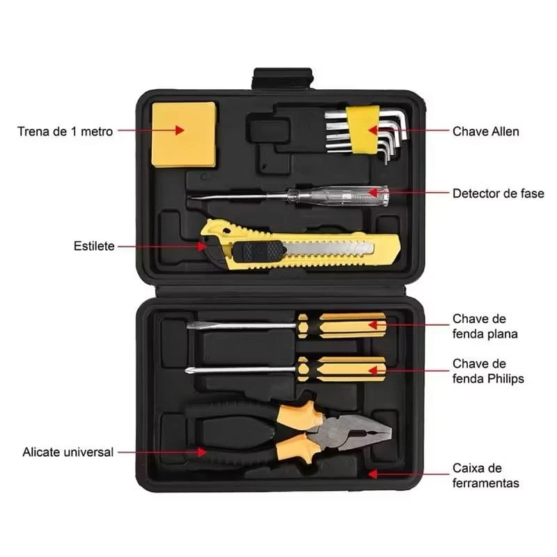 Kit de ferramentas completo em maleta prática, perfeito para reparos domésticos, montagem de móveis e projetos DIY. Inclui alicate universal, estilete retrátil, chave de fenda plana e Philips, conjunto de bits Allen, e uma caixa organizada para manter tudo à mão. Ergonomia, durabilidade e praticidade para uso diário, ideal para iniciantes e profissionais.