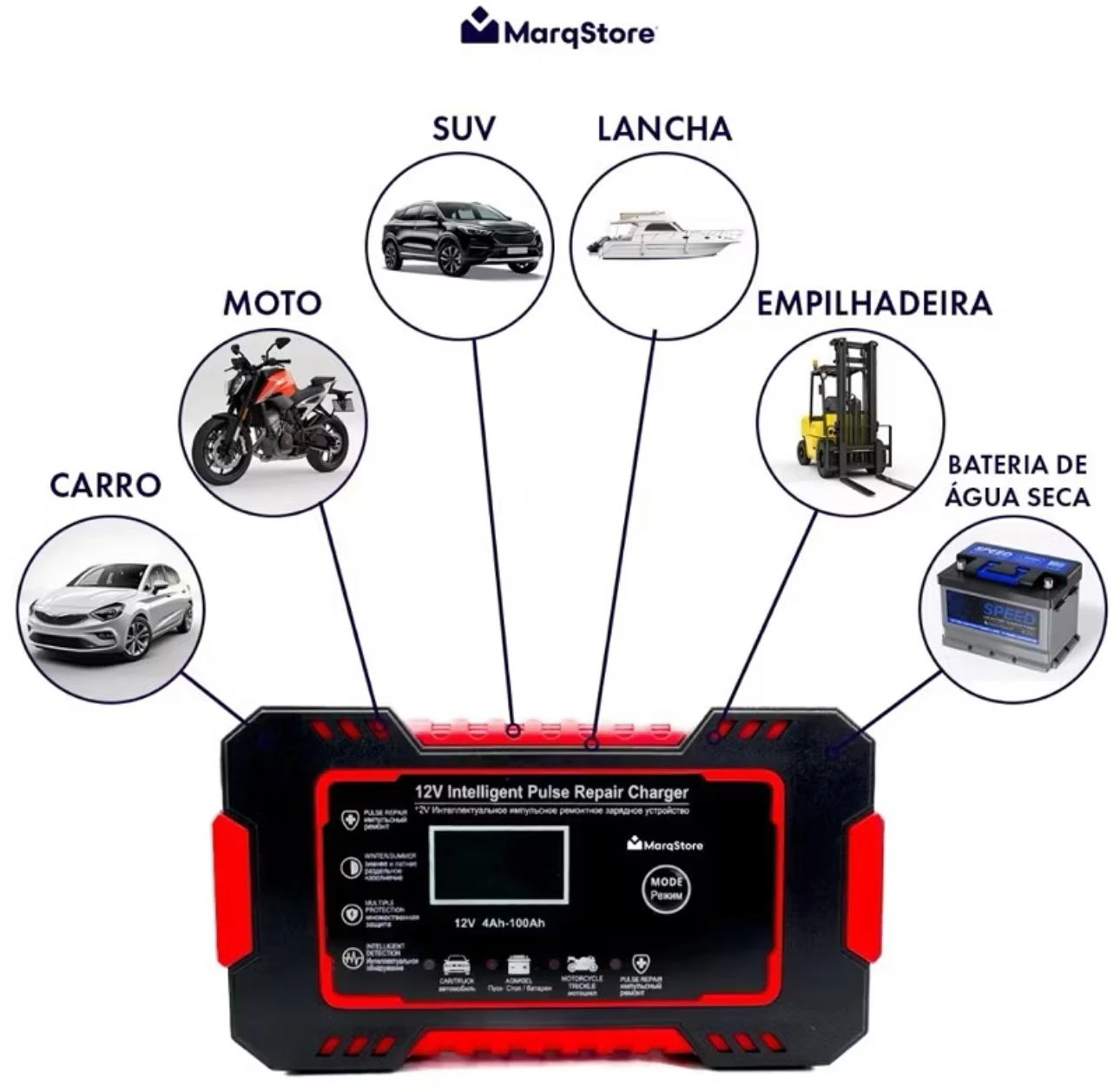 Carregador de Bateria 12V Inteligente com função de reparo por pulso. Compatível com baterias de carro, moto, SUV, lancha, empilhadeira e baterias secas, oferecendo recarga estável, diagnóstico rápido e proteção contra sobrecarga, temperatura e curto-circuito. Painel digital facilita o uso, com modos automáticos e de reparo para manter a performance e a vida útil da bateria.