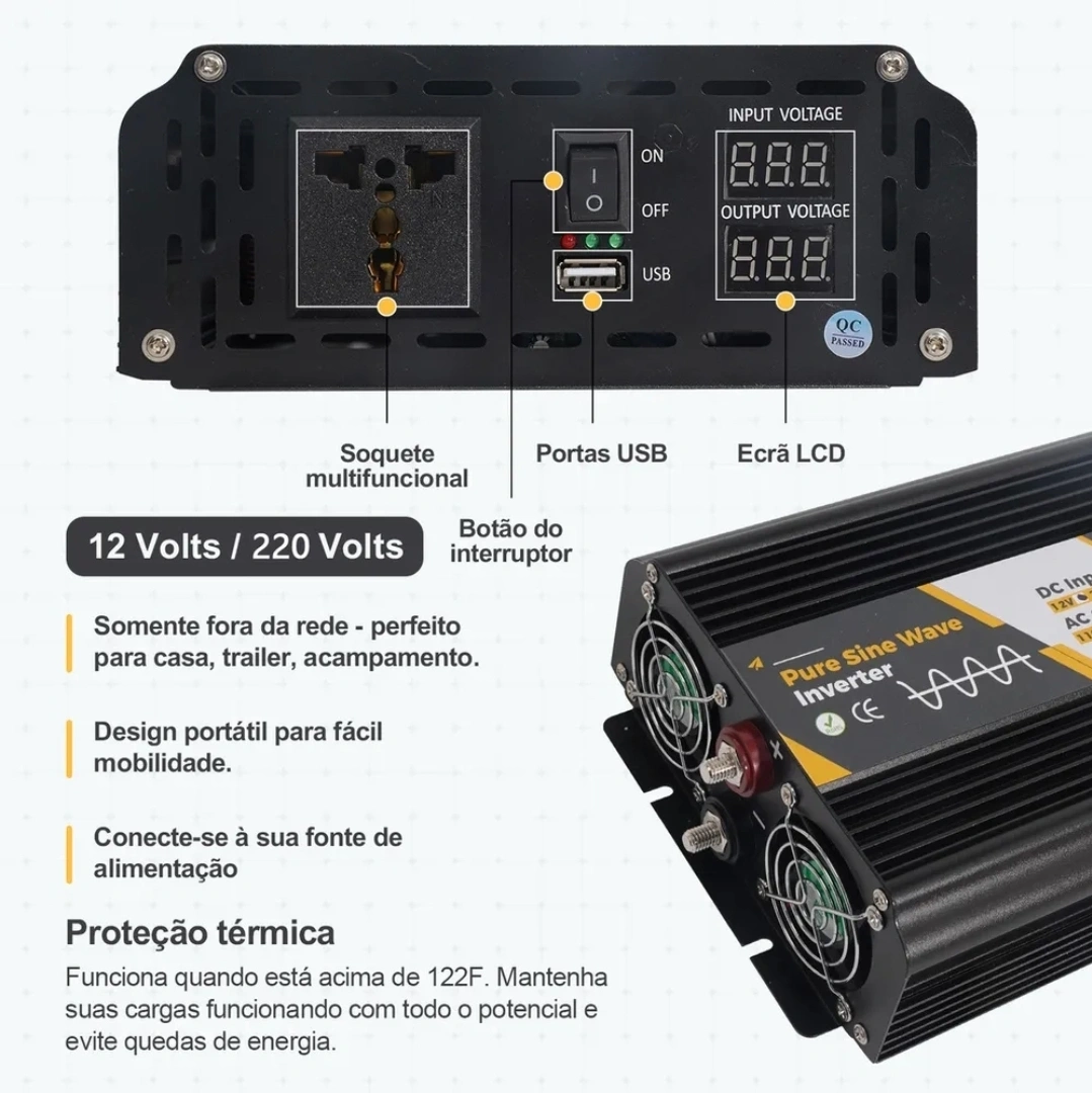 Converte 12V DC para 127V AC, entregando até 2000W contínuos e picos de 4000W, ideal para alimentar eletrônicos e equipamentos com segurança e estabilidade.