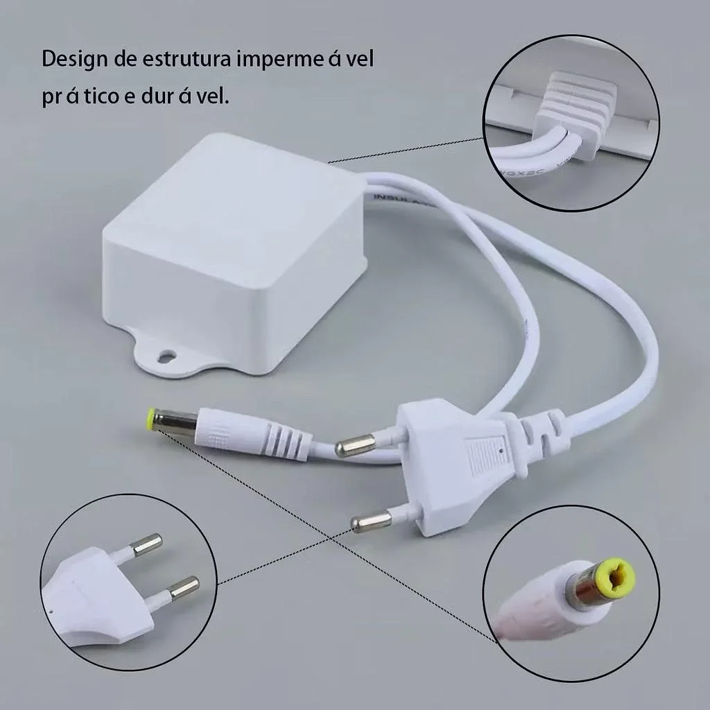 Carregador externo com transformador compacto e tomadas intercambiáveis para alimentação estável de equipamentos eletrônicos. Design à prova d'água, construção resistente e plugues intercambiáveis para uso em viagens. Acompanha conector DC cilíndrico para ligar câmeras, rádios e outros dispositivos. Ideal para quem busca solução prática, segura e compatível com diversos plugues internacionais. Compacto, fácil de transportar.