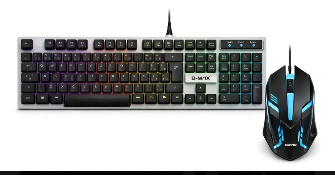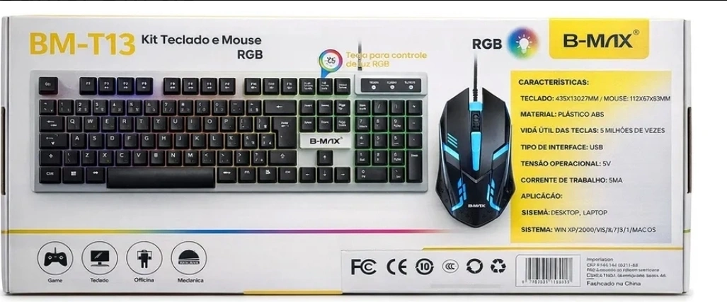 O kit teclado e mouse B-Max BM-T13 é uma opção gamer de entrada, apresentando iluminação RGB, conexão com fio USB e estrutura semimecânica. O teclado possui layout em português (ABNT2), sendo uma escolha popular pelo custo-benefício para computadores e notebooks.