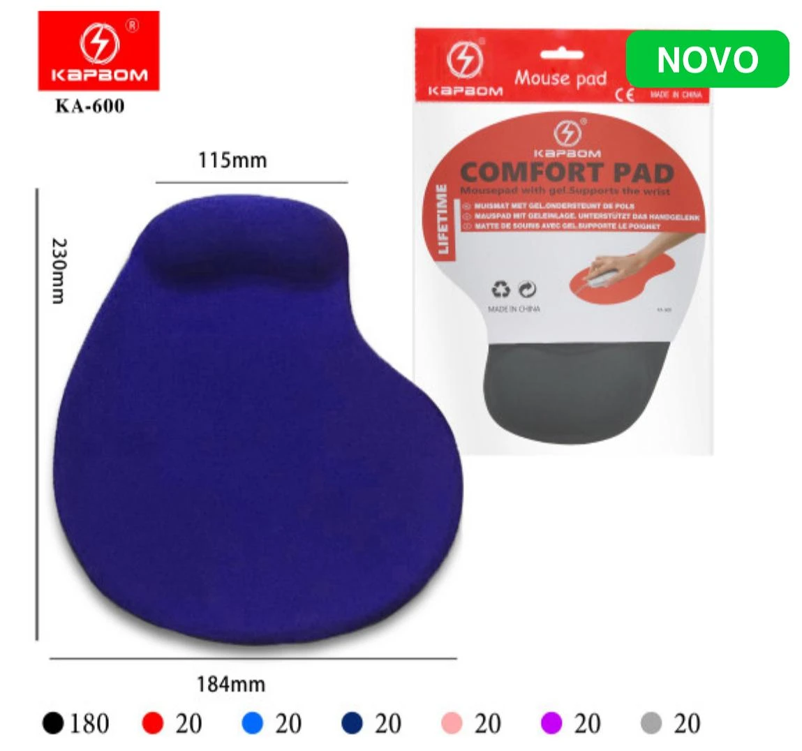 Mouse pad com apoio de pulso em gel azul, ergonômico e confortável para uso diário. O preenchimento suave oferece amortecimento que reduz a tensão no punho durante longas sessões de jogos, trabalhos, estudos e atividades de tela. A base antiderrapante mantém o acessório firme na mesa, proporcionando movimentos precisos e sem deslizamentos. Fácil de limpar, durável e compatível com qualquer mouse.