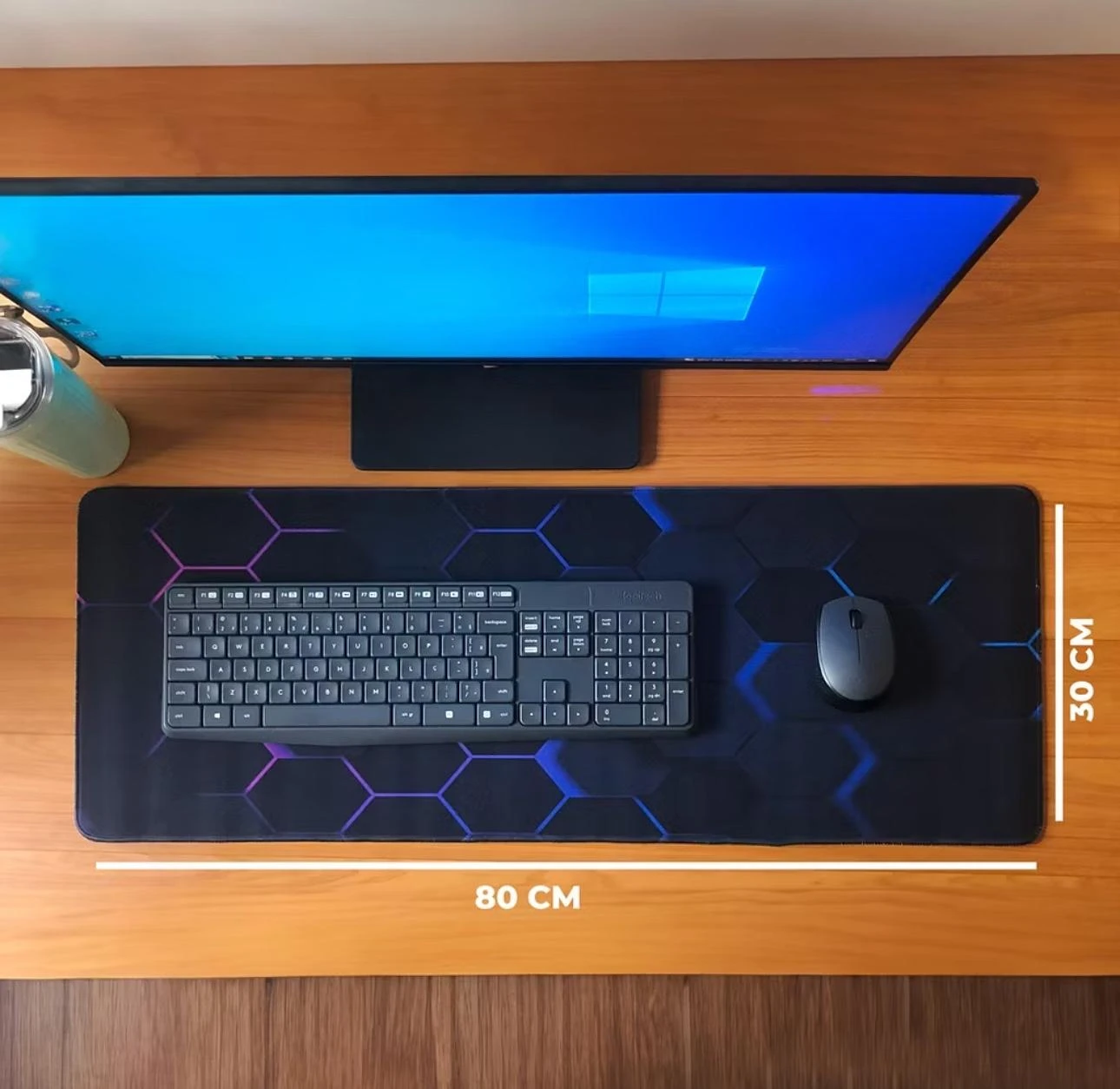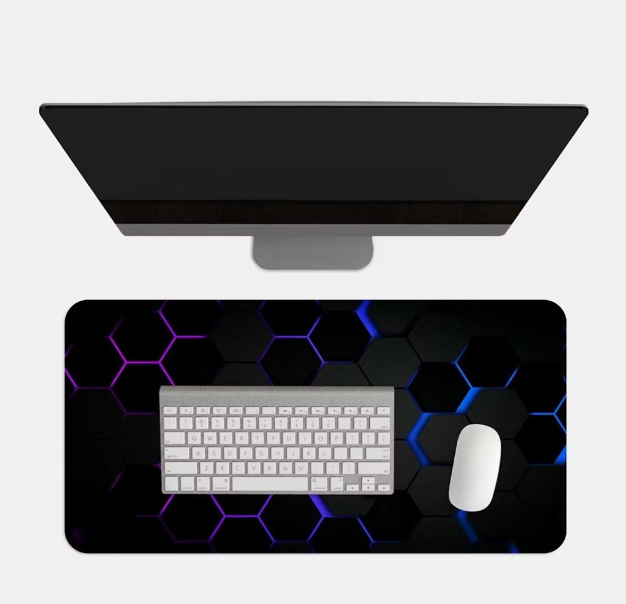 Mouse pad extra grande, perfeito para setups de PC e gamers. Possui superfície lisa que desliza o mouse com precisão e amplo espaço para teclado. Estampa hexagonal com tons roxo e azul adiciona estilo ao seu desk. Base antiderrapante evita deslizamento, protege a mesa e facilita a organização. Ideal para quem busca conforto, velocidade e visual moderno.