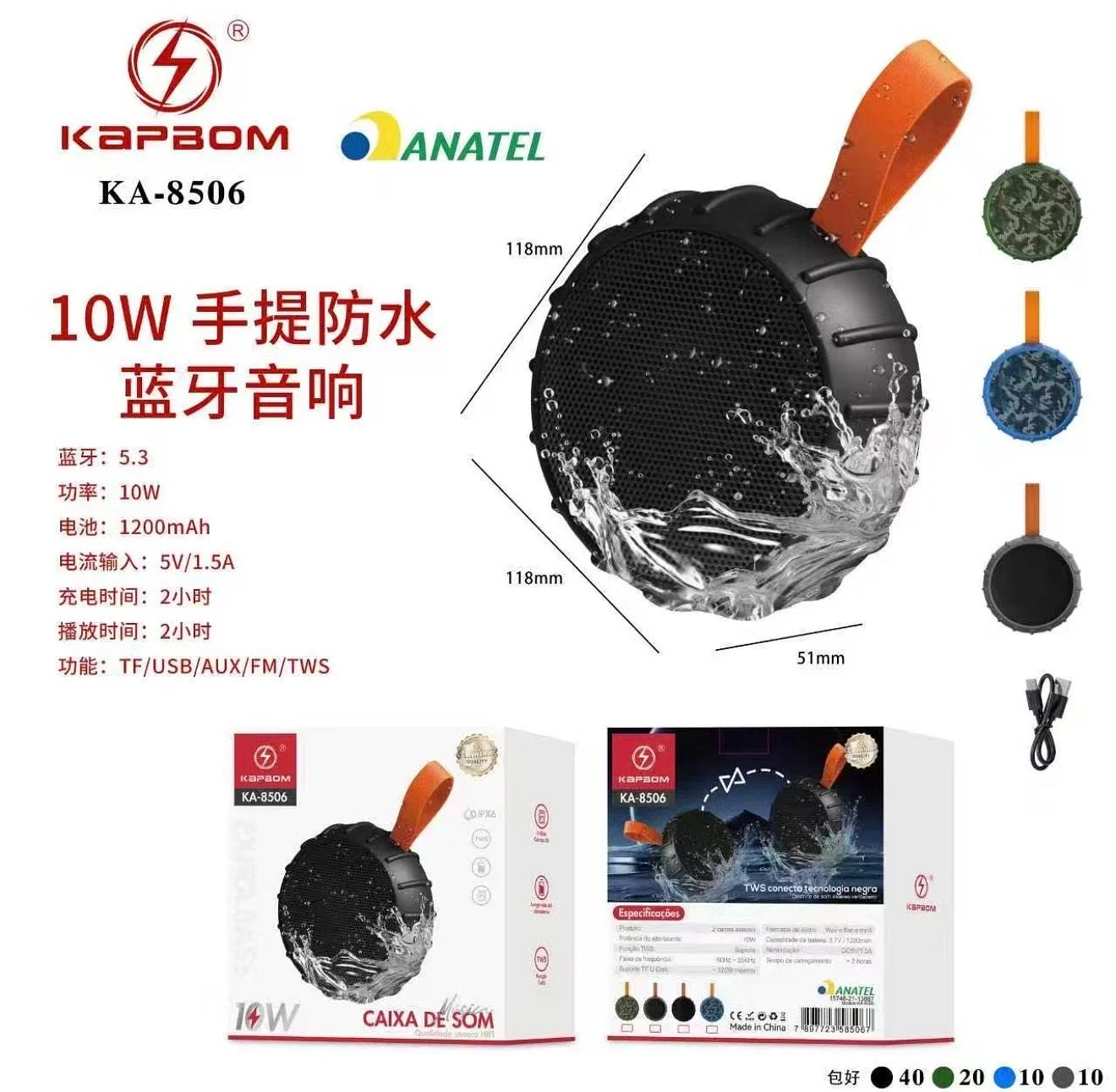 Caixa de Som Bluetooth 10W KA-8506, compacta e resistente à água, perfeita para levar onde quiser. Bateria de 1200mAh oferece até 2h de reprodução com áudio claro e graves potentes. Conectividade completa: Bluetooth, TF/SD, USB, AUX, FM e modo TWS para emparelhar com outra caixa. Carregamento rápido em ~2h (entrada 5V/1,5A). Leve, com alça laranja para transportar em praia, trilhas, festas e acampamentos.