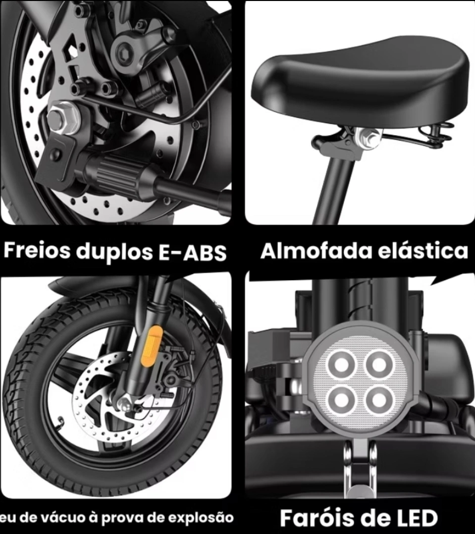 Bicicleta elétrica dobrável ideal para a vida urbana: prática, compacta e sustentável. Alcance e velocidade de até 35 km/h com motor de torque estável, bateria de longa duração e recarga rápida. Estrutura robusta, pneus largos, freio a disco, iluminação integrada e suporte traseiro para bagagem. Conforto garantido com selim acolchoado e guidão ergonômico. Perfeita para deslocamentos diários, passeios e viagens rápidas.