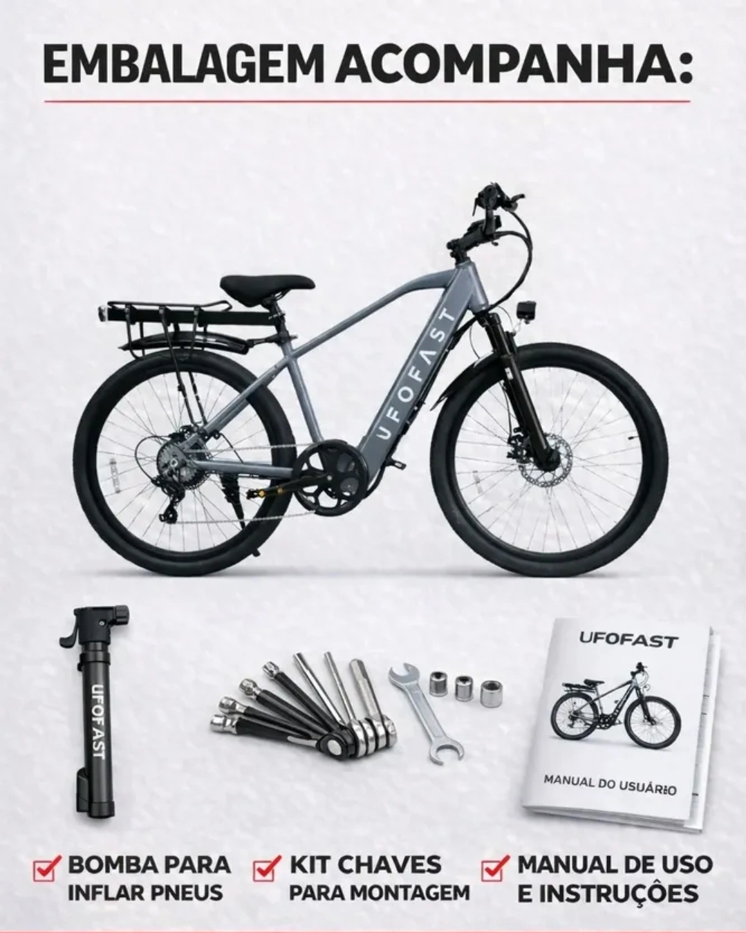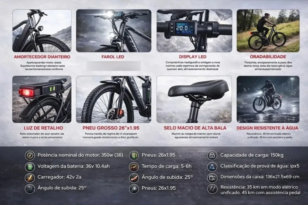 Bicicleta elétrica robusta para cidade e trilhas leves. Motor nominal de 350 W com bateria 36 V 10,4 Ah oferece assistência estável e autonomia confiável. Pneus 26x1.95, suspensão no selim e quadro resistente garantem conforto em terrenos variados. Display LED facilita acompanhar velocidade e energia; faróis e lanternas completam a segurança. Suporta até 150 kg, IPX5, ideal para quem busca performance e durabilidade.