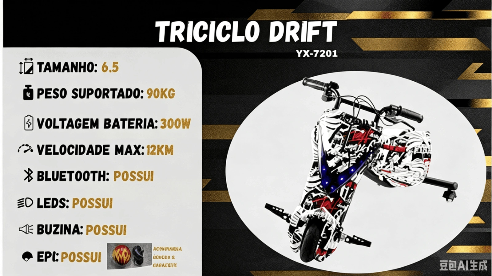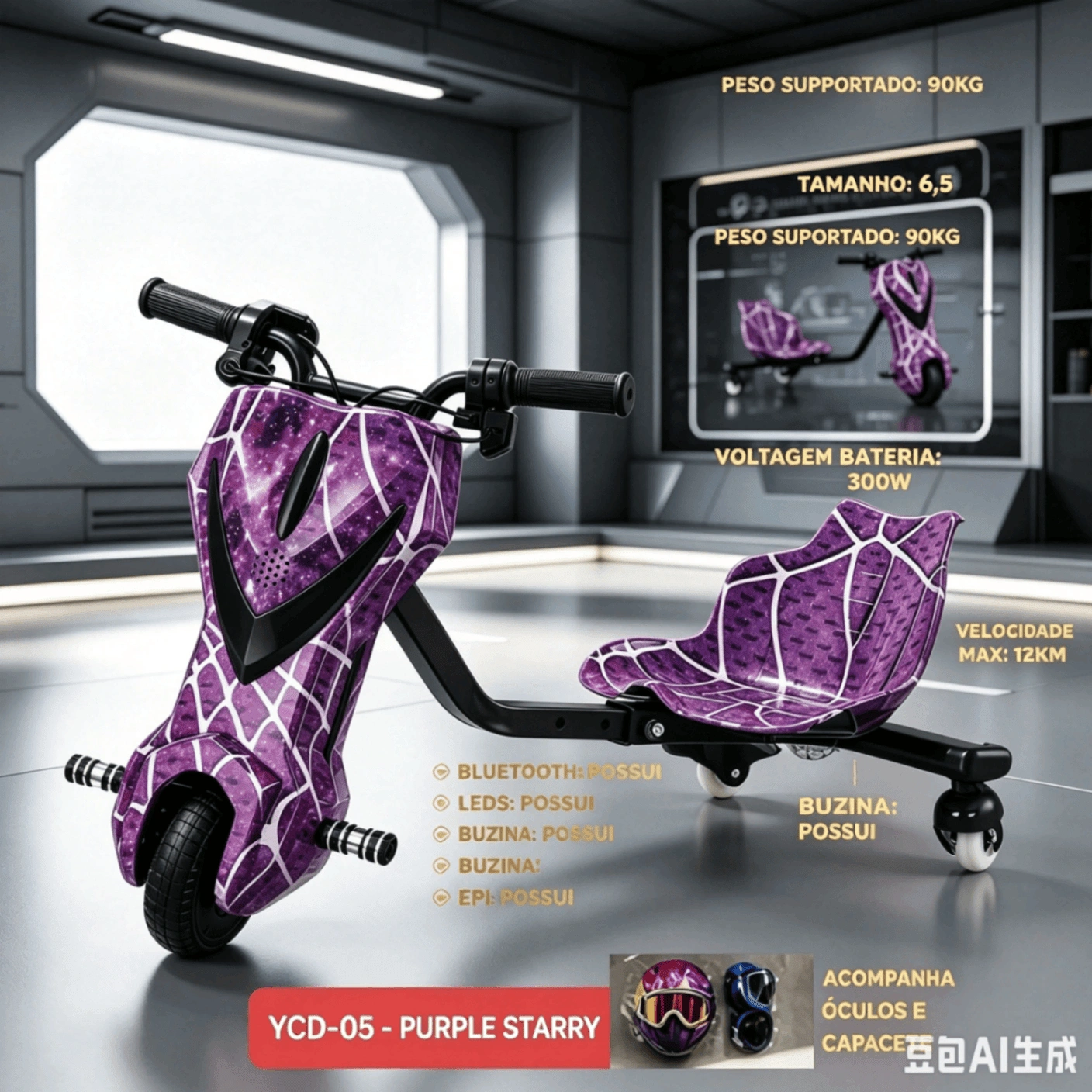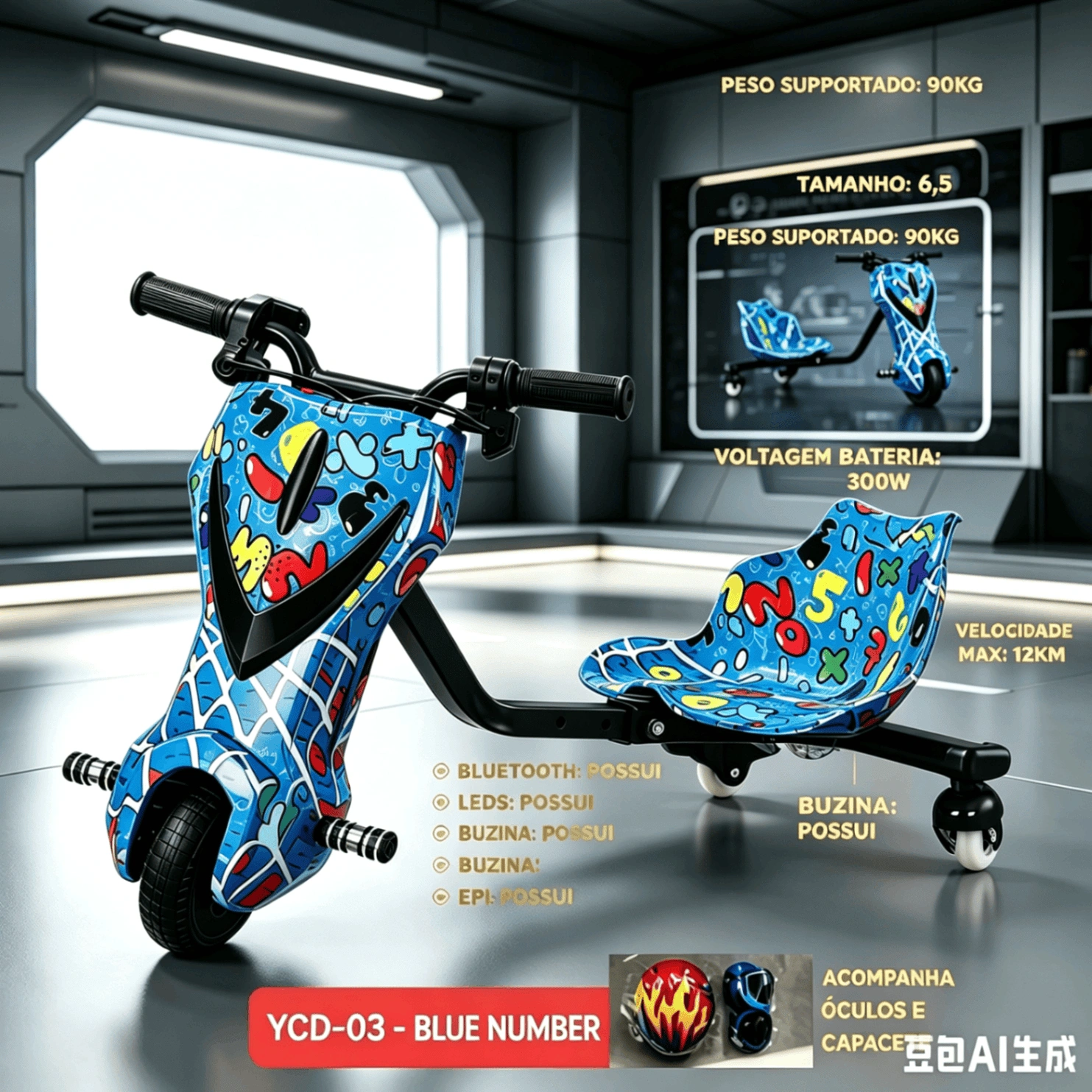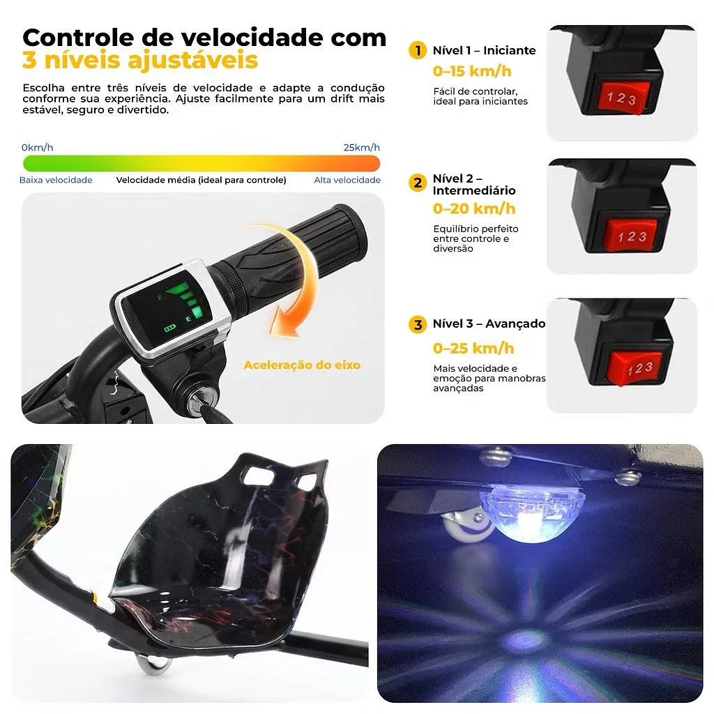 Triciclo Drift Elétrico Infantil: diversão com potência. Motor de 300 W oferece assistência estável, velocidade até 12 km/h e capacidade de 90 kg, ideal para iniciantes dominarem o equilíbrio com estilo drift.