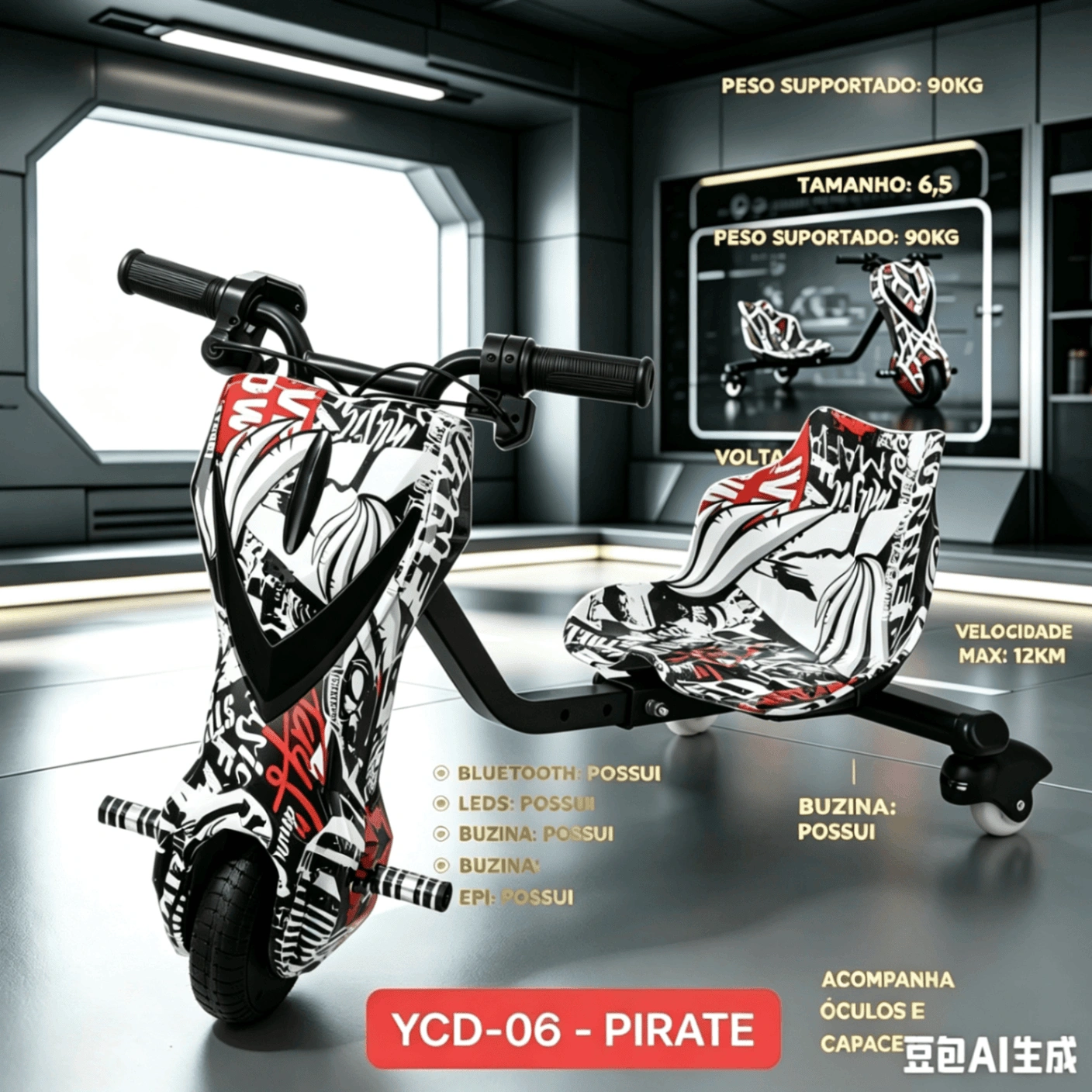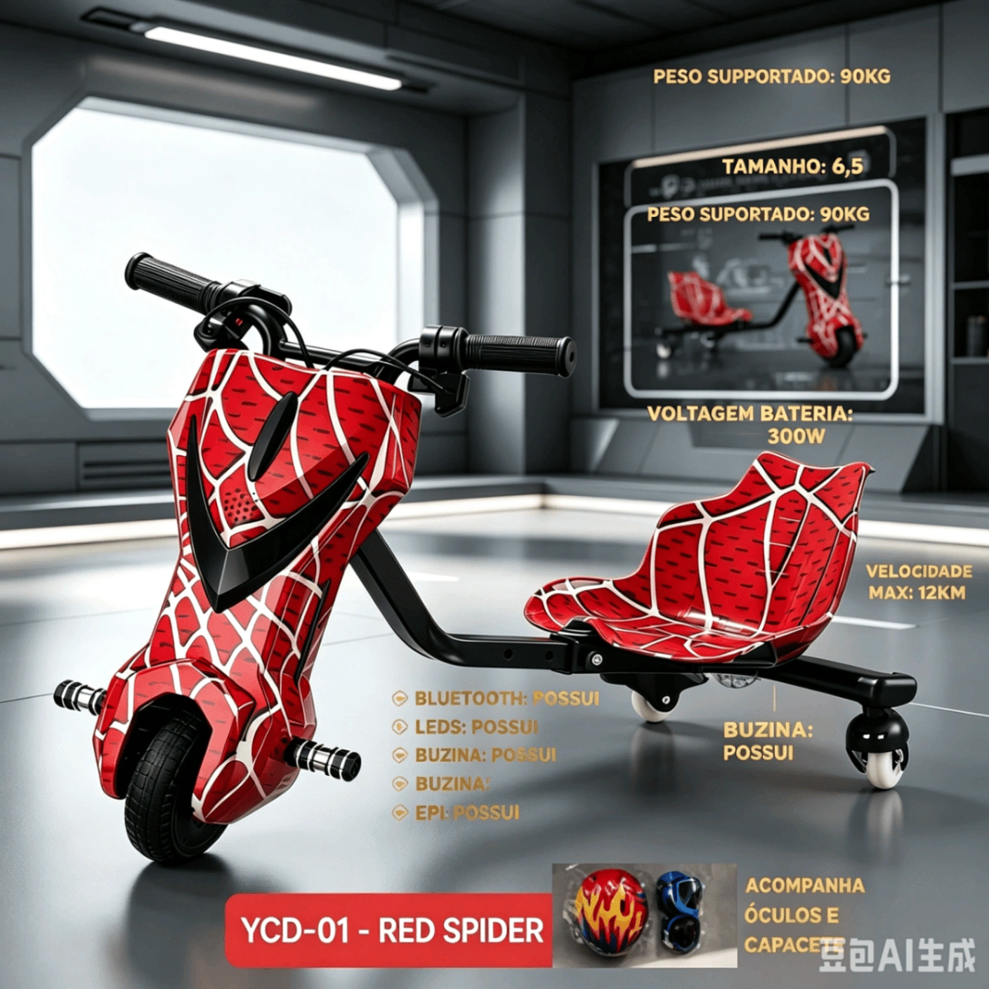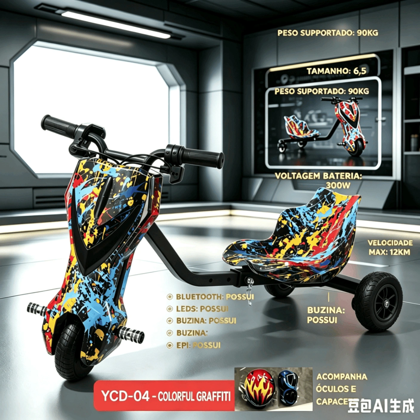 Triciclo Drift Elétrico Infantil: diversão com potência. Motor de 300 W oferece assistência estável, velocidade até 12 km/h e capacidade de 90 kg, ideal para iniciantes dominarem o equilíbrio com estilo drift.